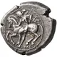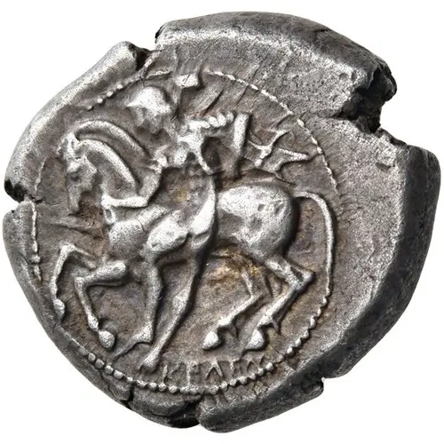 | Obverse description | Nude ephebe, holding whip in his left hand, jumping from horse galloping to left (performing the kalpé, a horse race in which the rider jumps from his horse and runs beside it). |
