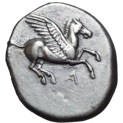 | توضیحات پشت سکه | Helmeted head of Athena left; behind, forepart of bull butting left. |