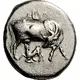 | Descripción del anverso | Cow standing right, her head bent back to left to suckle her calf, kneeling left beneath her. Above Kithara between Σ - Ω |