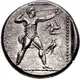 | Arka yüz açıklaması | Slinger in throwing stance right; to right, counterclockwise triskeles of legs above eagle standing right; all within dotted square border in shallow incuse square. |