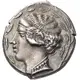 | 表面の説明 | Head of the nymph Terina to left, wearing ampyx, simple torque and a necklace of pendants; around, olive wreath. |