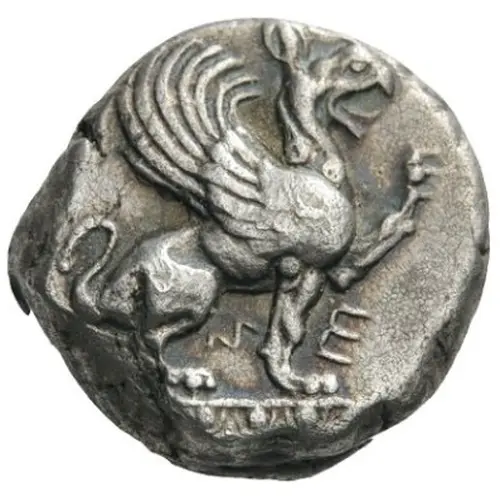 | Obverse description | Griffin, with open mouth, seated to right on ornamental pedestal, his left forepaw raised |