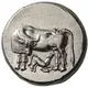 | Description de l’avers | Cow standing to left with Δ on her rump, turning her head back to right to lick calf suckling to right |