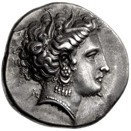 Opis awersu Head of Persephone right, wearing wreath of grain ears, earring with rosette and five pendants, and pearl necklace