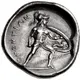 Opis rewersu Ajax, nude but for crested Corinthian helmet, holding sword in right hand, shield decorated with palmette and griffin on left arm, advancing right on ground line. OΠONTIΩN flanking and below a spear facing left.