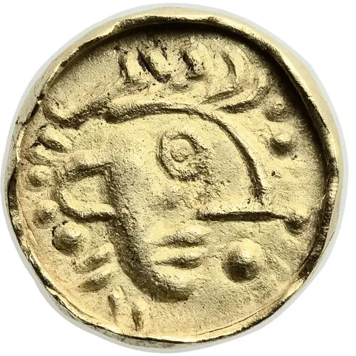 Descrizione del dritto Stylized head of Athena right; five pellets around.