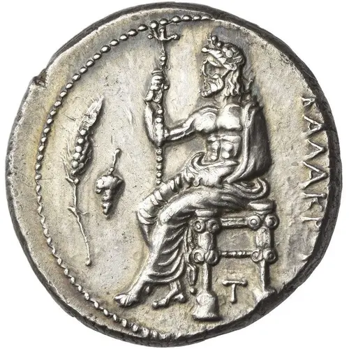 | Obverse description | Baaltars seated left on backless throne, holding lotus-tipped scepter in his right hand and resting his left on his chlamys at his waist; to outer left, grain ear and grape bunch; below throne, T. |
