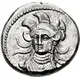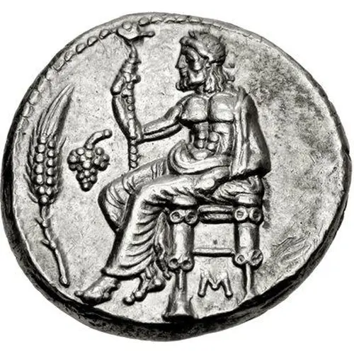 | 表面の説明 | Baaltars seated left, his torso facing, holding lotus-tipped scepter in extended right hand, left hand holding chlamys at his waist; grain ear and grape bunch to left, M below throne. |
