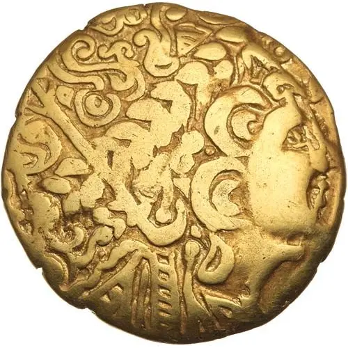 | Reverse description | Celticized horse right, stylized charioteer above, little crescent below. |