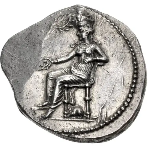 | Obverse description | Aphrodite seated left, holding phiale; to left, small Eros flying right, crowning her; below throne, mouse left. |