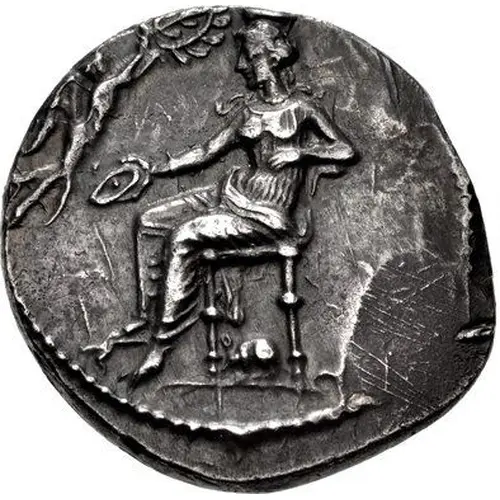 | Description de l’avers | Aphrodite seated left, holding phiale; to left, Nike flying right, crowning her with wreath; below throne, small mouse left. |