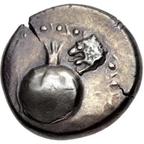 توضیحات روی سکه Pomegranate; to upper right, forepart of lion left.