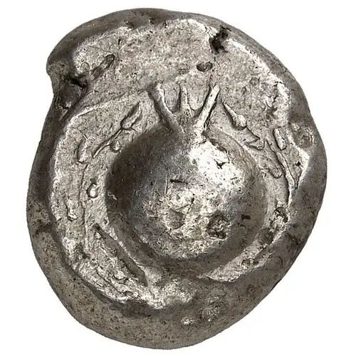 | Obverse description | Pomegranate hanging downwards within a wreath of pomegranate leaves. |