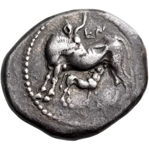 Obverse description Cow standing left, her head turned back to right, suckling calf standing beneath her to right; EN above.