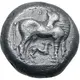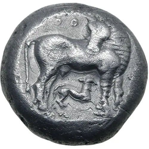 | توضیحات روی سکه | Heifer standing to right, head turned to left towards calf suckling left below; two annulets above. |
