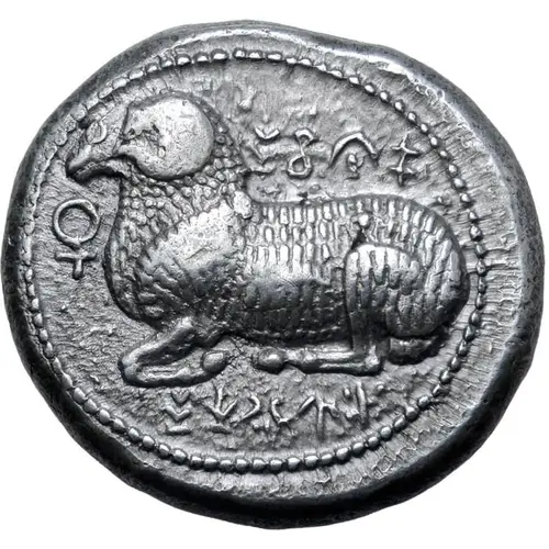 | Описание реверса | Ram`s head to left, Cypriot character `a` above, ankh symbol below; all within incuse circle. |