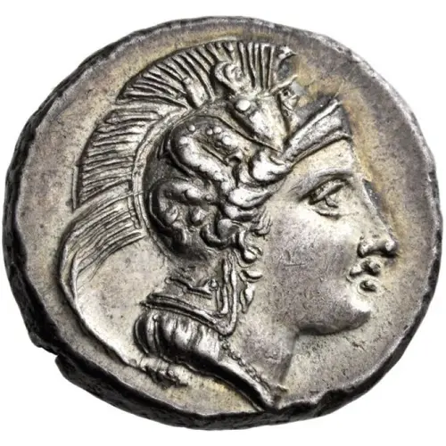 توضیحات روی سکه Head of Athena to right, wearing crested Attic helmet adorned, on the bowl, with Skylla hurling a stone to right and, on the neck guard, with a hippocamp, pendant earring and a pearl necklace.