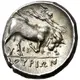 توضیحات پشت سکه Bull butting to right, his head lowered and turned to his right; above, Nike flying to right, holding, with both hands, a wreath to crown the bull; below the bull`s body and head, ΕΥ - ΦΡ; on the groundline, between the bull`s hind legs, finch flapping its wings to right.
