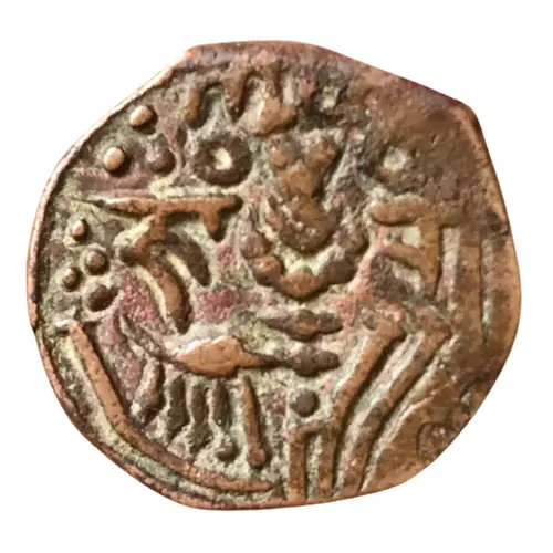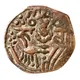 | Reverse description | Highly stylized King standing facing, sacrificing at altar at left, legend at right in Sharada script: deva |