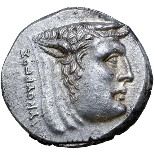 Mô tả mặt trước Head of river-god Achelӧos right; magistrate`s name to left.