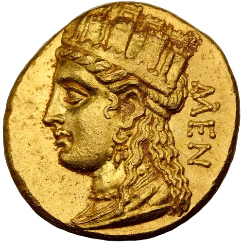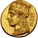 Draped bust of Aphrodite left, wearing crown with five semi-circular plates, taenia, beaded hoop earring, and torque, seen from front, hair flowing in ringlets behind and one long curl across cheek. |