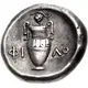 Amphora; grape bunch on vine above, magistrate name across field; all within incuse concave circle.