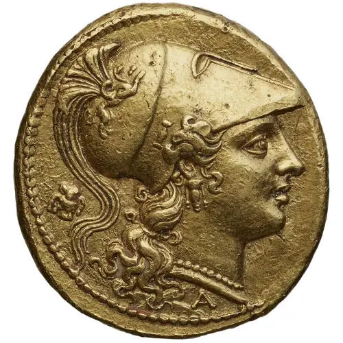 | Obverse description | Head of Athena right, hair flowing loose with one tie at neckline and upswept at temple, wearing triple-pendant earring, necklace and crested Corinthian helmet pushed back on head, the bowl decorated with griffin leaping right; owl standing facing behind with spread wings, A below neck truncation. |