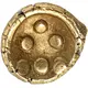 Beschrijving voorzijde Bird`s head to left (beak between two pellets) within open wreath.