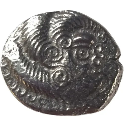 | Obverse description | Stylized human head facing right. With the curved hair, a round eye in front and the nose in the shape of a bulging epsilon in the centre. |