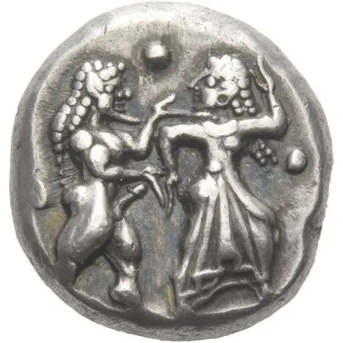 Ön yüz açıklaması Nude ithyphallic satyr grasping right arm of nymph, trying to move away from him; in field left and right and above, three pellets.