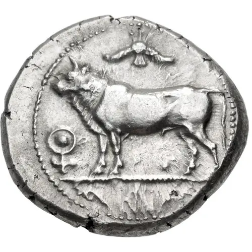 | Descrizione del dritto | Bull standing to left; winged solar disk above; ankh symbol before; palmette ornament in exergue. |