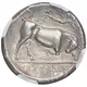 Reverse description Bull butting right, head turned facing; Nike flying right above crowning bull.