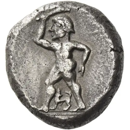 | Popis líce | Heracles, naked, advancing left, raising club; below, a small dog standing left and looking upwards. |