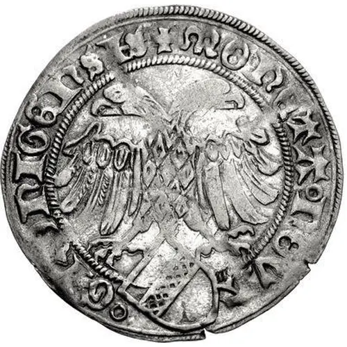 | Obverse description | Two-headed eagle facing forward with wings spread, tilted shield with city arms below, dividing legend. |