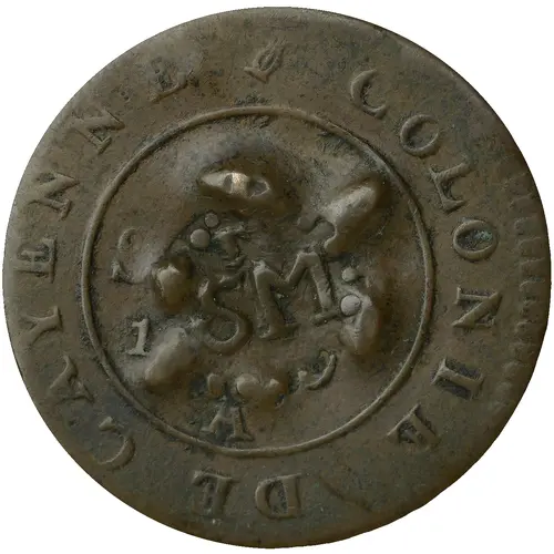 | Obverse description | Countermark `STM` in beaded circle on Cayenne Colony 2 Sous piece, which displays a crown above three fleur-de-lis surrounded by legend. |