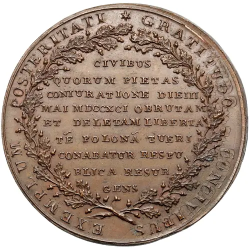 | Legenda do anverso | CIVIBUS QUORUM PIETAS CONIURATIONE DIE III. MAI. MDCCXCI OBRUTAM ET DELETAM LIBERTA TE POLONA TUERI CONABATUR RESPU BLICA RESUR GENS GRATITUDO CONCIVIBUS EXEMPLUM POSTERITATI |