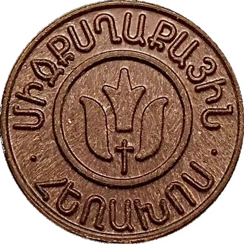 توضیحات روی توکن Stylized ornament (plant) in the center, Armenian lettering on top and bottom.