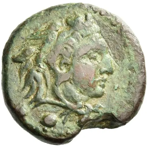 | Obverse description | Head of young Heracles right, wearing lion’s skin headdress; below, three pellets (mark of value). |