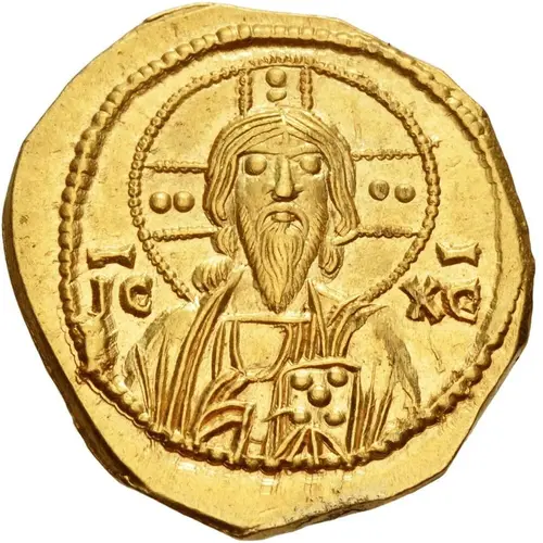 | Obverse description | Bust of Christ, nimbate with two pellets in each arm of cross, holding Gospels, dividing legend. |