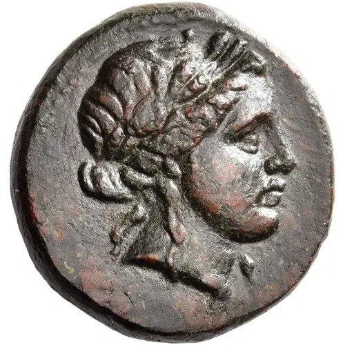 | Obverse description | Laureate head of Apollo to right, his hair bound up in a bun at the back but with some locks falling down the back of his neck |