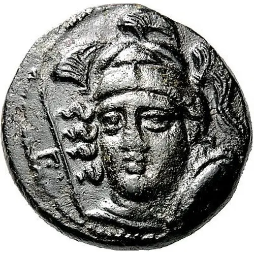 | Obverse description | Helmeted head of Athena Parthenos facing, turned slightly to the left, with shield over her left shoulder and spear over her right. To the left, between spear and border of dots, Π |