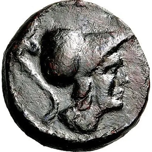 Obverse description Head of Athena in crested Corinthian helmet to right.