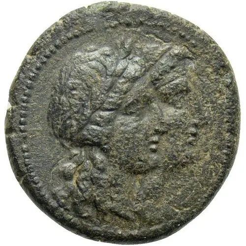 | Aversbeschreibung | Jugate heads right of Apollo, laureate, and Artemis; dotted border. |