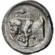 | Описание реверса | Forepart of man-headed bull (the river-god Gela) advancing left through reeds; ibis and garlanded altar before his mid section. In left field, fish swimming upwards and above, barley grain. |