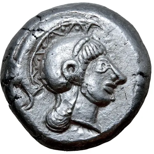 | Obverse description | Archaic head of Athena right, wearing crested helmet decorated with chevron and dot pattern |