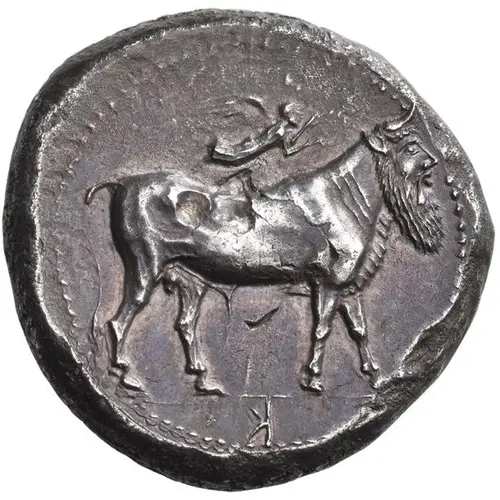| Obverse description | Man-headed bull, the river god Amenanos, walking to right; above, Nike flying right to crown him; in exergue, K. |