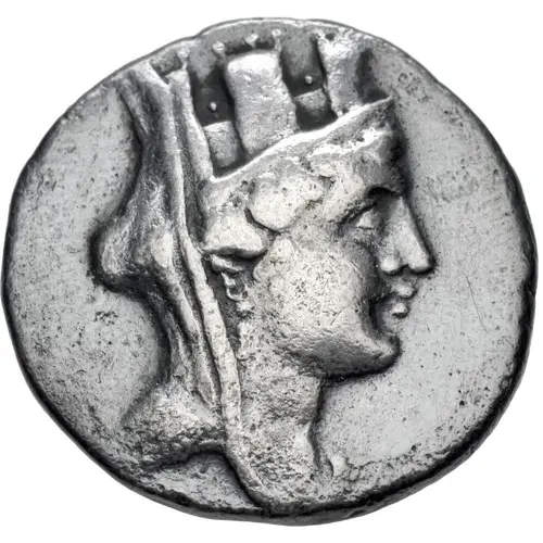 Aversbeschreibung Bust of Tyche, right, turreted, veiled, draped, with necklace and earrings; monogram behind.