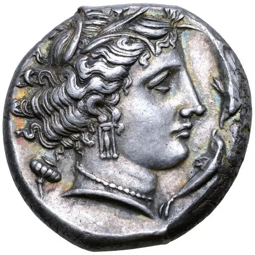 | Obverse description | Head of Tanit-Persephone to right, wearing wreath of grain leaves; two dolphins before and poppy behind. |