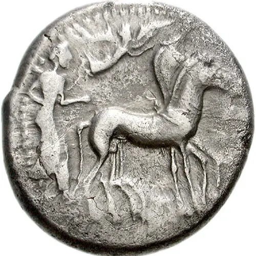| Reverse description | Forepart of man-headed bull right within circular incuse. Inscription beneath it. |