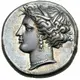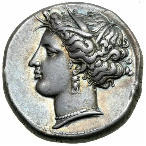 | Obverse description | Wreathed head of Arethusa left, wearing triple-pendant earring and necklace. |